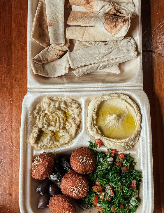 We halen een mega lekkere midden-oosterse lunch bij Ana’s Genie. We hebben pita’s met falafel, vers gemaakte hummus, babaganoush en tabouleh. Echt yum! Ik neem ook nog twee passievrucht-sap mee, wat ze vers voor mijn neus maakt. Dat is ook echt hemels.